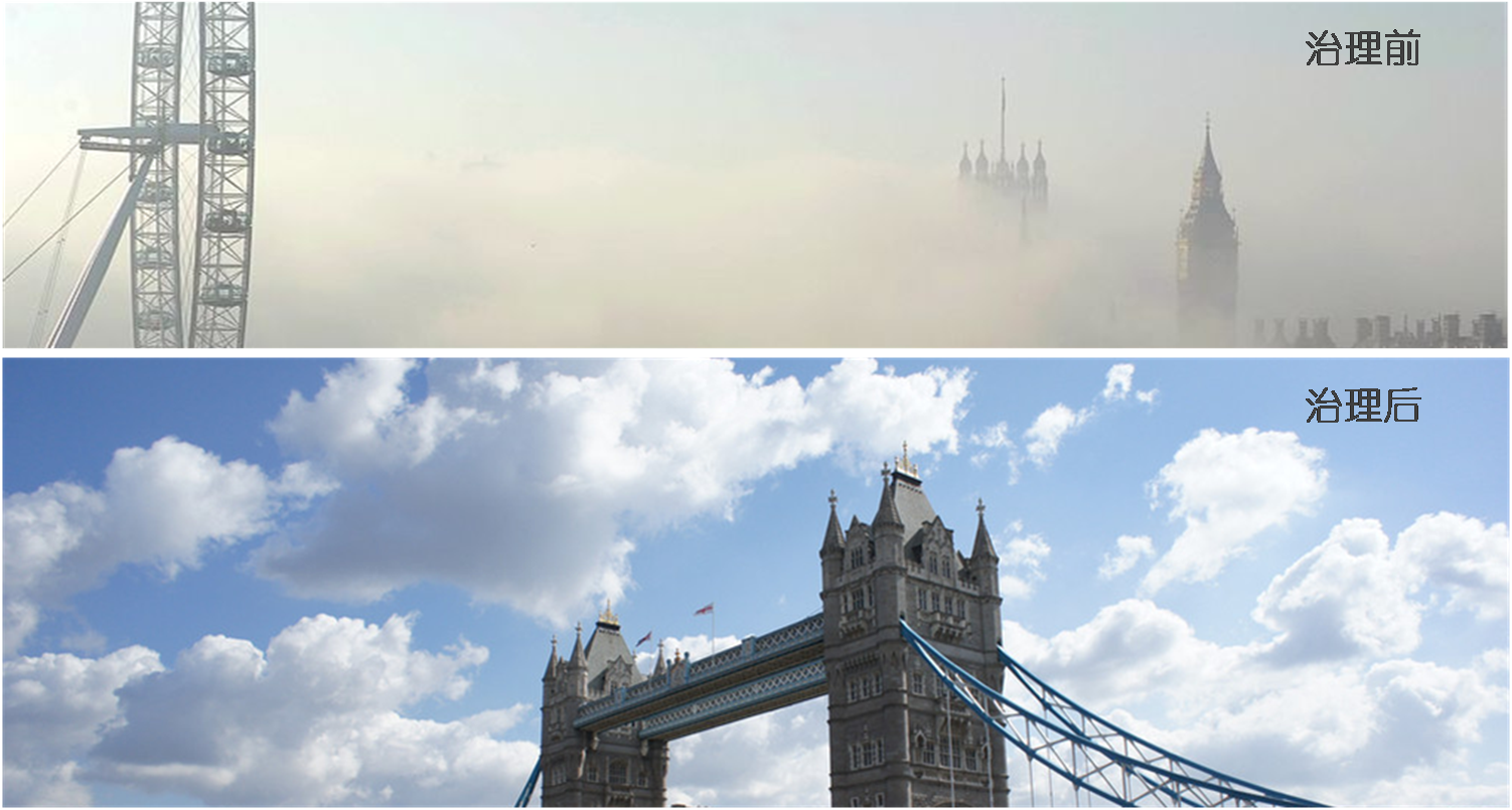 英国首都伦敦地处泰晤士河口,长年受西风和北大西洋暖流交汇的影响,因此气候潮湿,加之地处盆地,昼夜温差较大,空气流动不畅,容易形成大雾天气,并且循环往复,经久不散,成为伦敦一道独有的风景,也使“雾都”伦敦闻名于世。但是第一次工业革命之后,英国的工业高速开展,泰晤士河两岸工厂密布,以煤炭为主要燃料的蒸汽机大量投入使用;而且由于当时技术水平有限,煤炭燃烧率低,工厂排放的大量废气与大雾混在一起,笼罩在城市上空,原本白色的雾气变成了一片灰霾。自此,“雾都”成了空气污染的代名词。1952年12月5-10日,这些聚集已久的雾霾最终酿成史上著名的“伦敦烟雾事件”。下面借用一个短片来分析一下这次事件的始末。