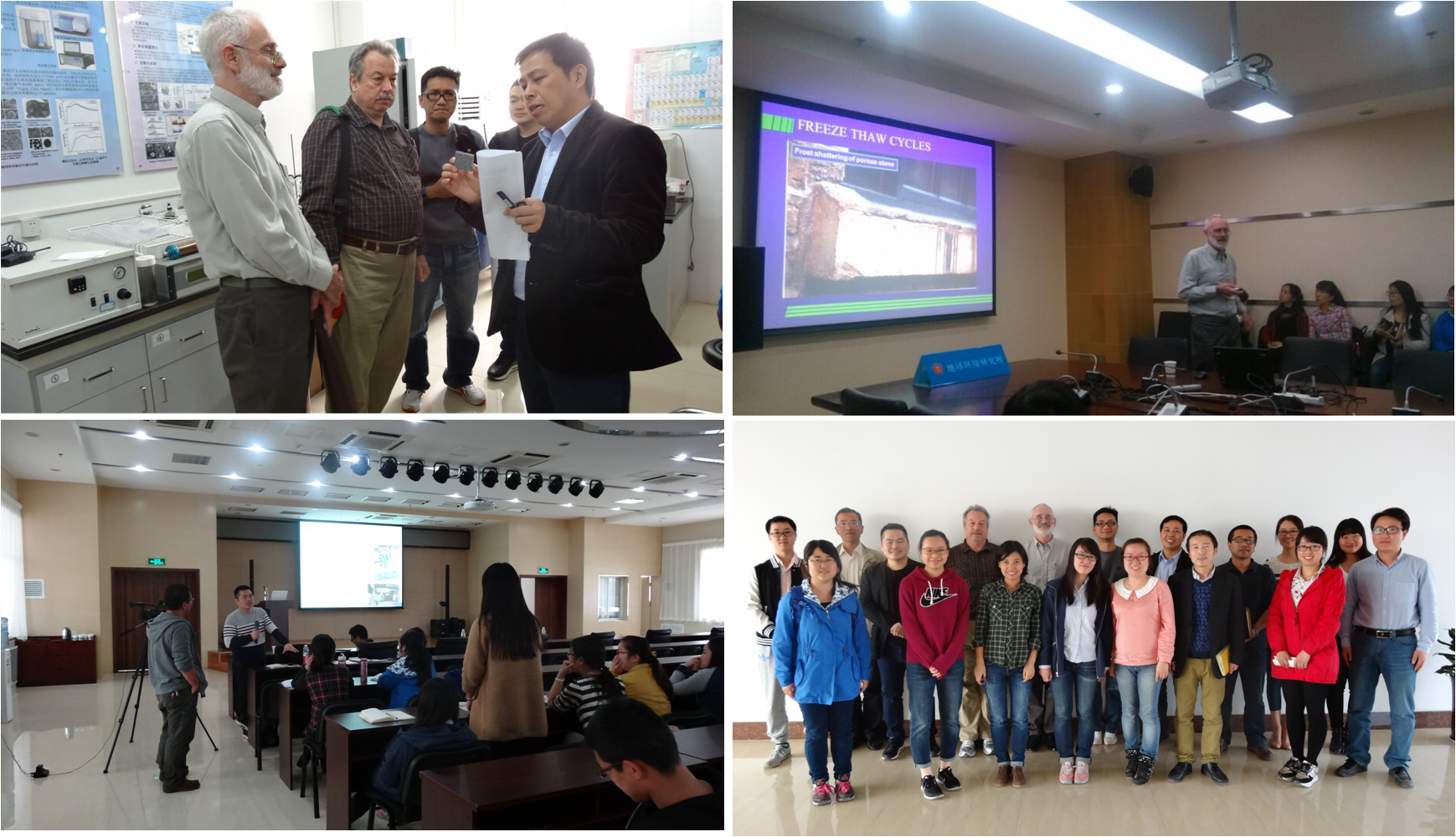 4月16日上午,Peter Brimblecombe, Frederick Dane Westerdahl博士,宁治博士以及何建辉博士参观了贝斯特全球奢华 化学与物理重点实验室,并听取实验室研究进展汇报。之后,Peter Brimblecombe 在“Chemistry of salts and crusts relevant to the conservantion of heritage materials”的报告中详细介绍了世界各地文物遗址中存在的问题,讲述文物界面发生的反应,分析文物破坏机理。当天下午,Frederick Dane Westerdahl博士分享了自己40多年的研究经验,全面介绍了在线监测仪器在选型、校准、质量控制方面应该注意的问题,并与实验室仪器管理人员进行了深入研讨。4月17日下午,宁治博士介绍了香港城市大学在新型传感器的研发和应用方面的案例,并就电化学传感器校准时湿度的控制原因和方法做了深入讲解,会后与在场的老师、同学进行了热烈讨论。